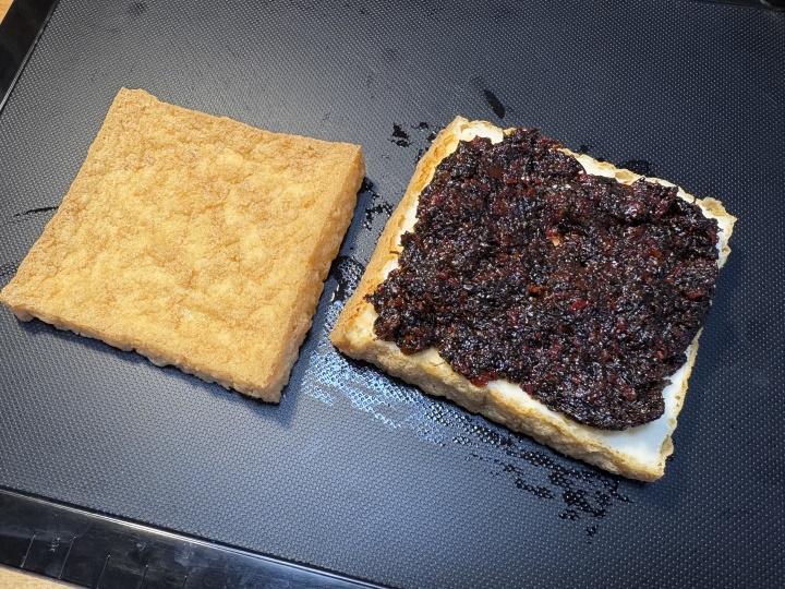 厚揚げは横にスライスして、海苔キムチをサンドする。