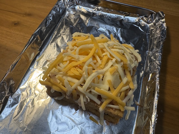上におかか、醤油をまき、シュレッドチーズをたっぷり振る。