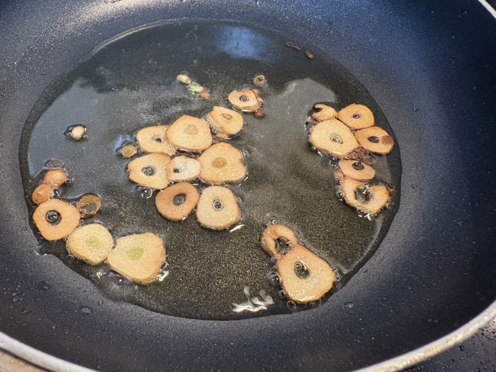 にんにくをスライスして、フライパンにオリーブオイル大さじ2を入れ、弱火で焦げないようにニンニクチップにする。取り出しておく。