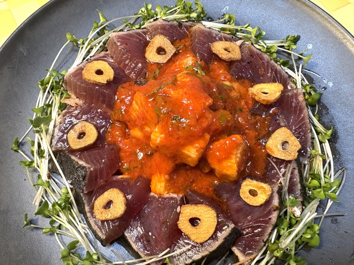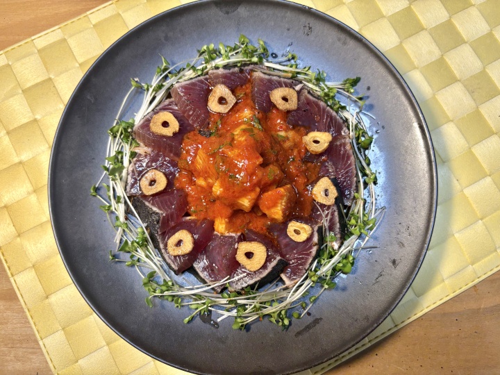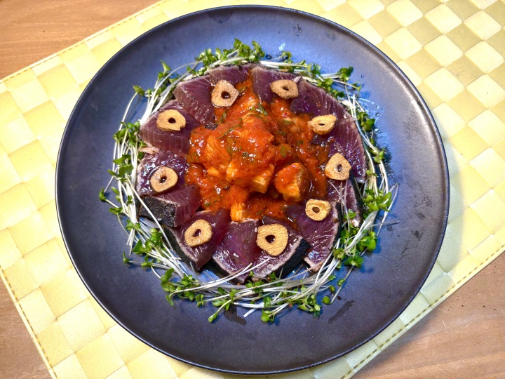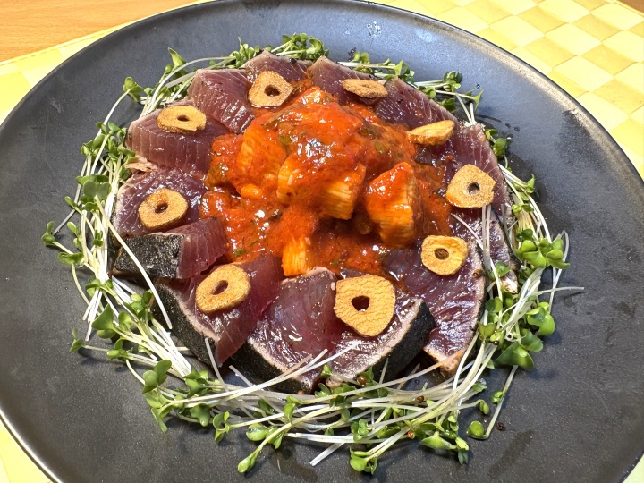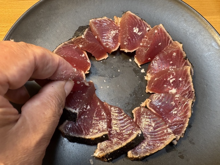 かつおのたたきはカットしてお皿に盛り、美味しい塩を振りかける。